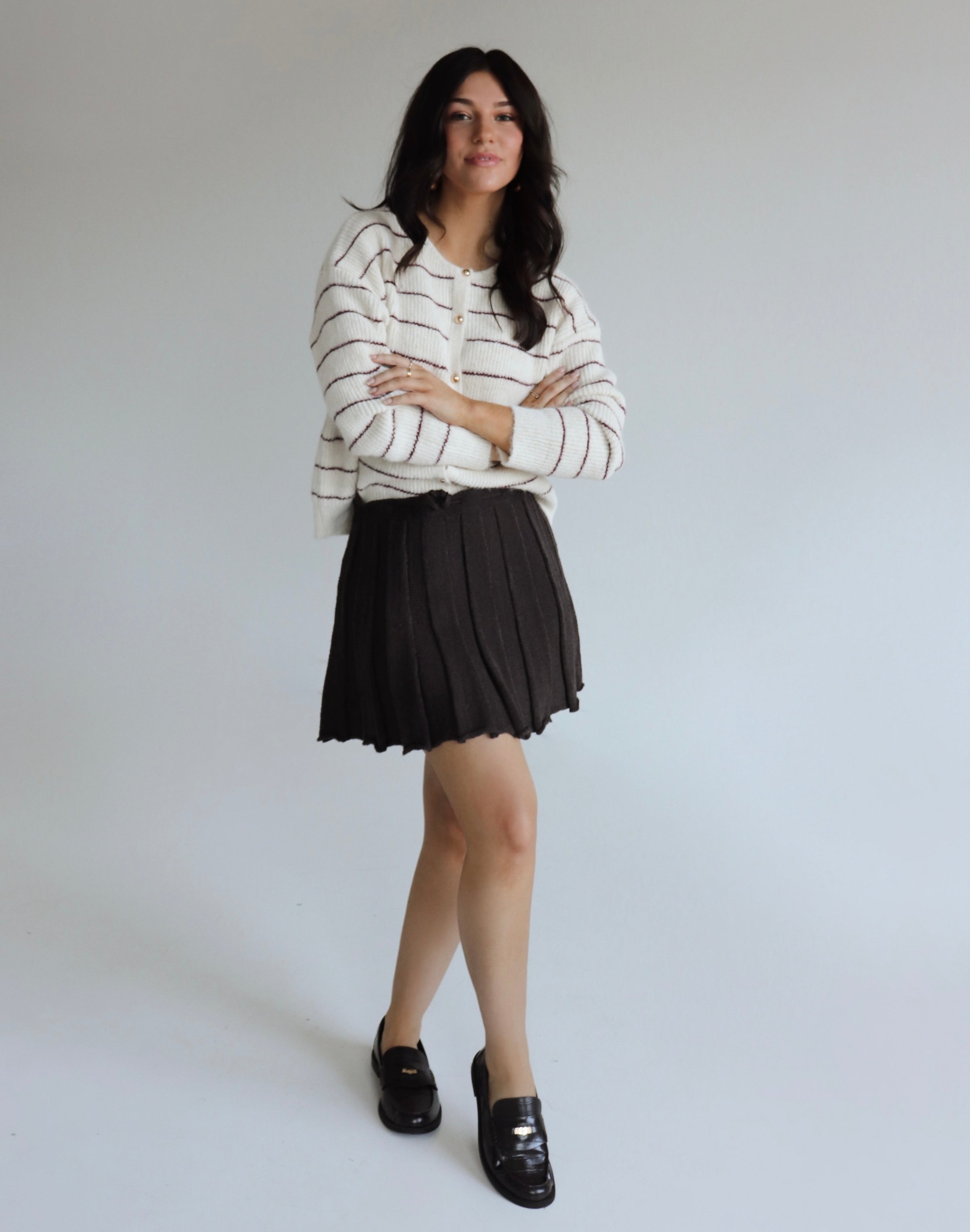 The Hollis Cardigan is a wardrobe staple you'll reach for constantly. Cream with dark red stripes and gold buttons, this gorgeous knit layers beautifully or stands alone. Perfect for work, weekend, or anywhere in between.
