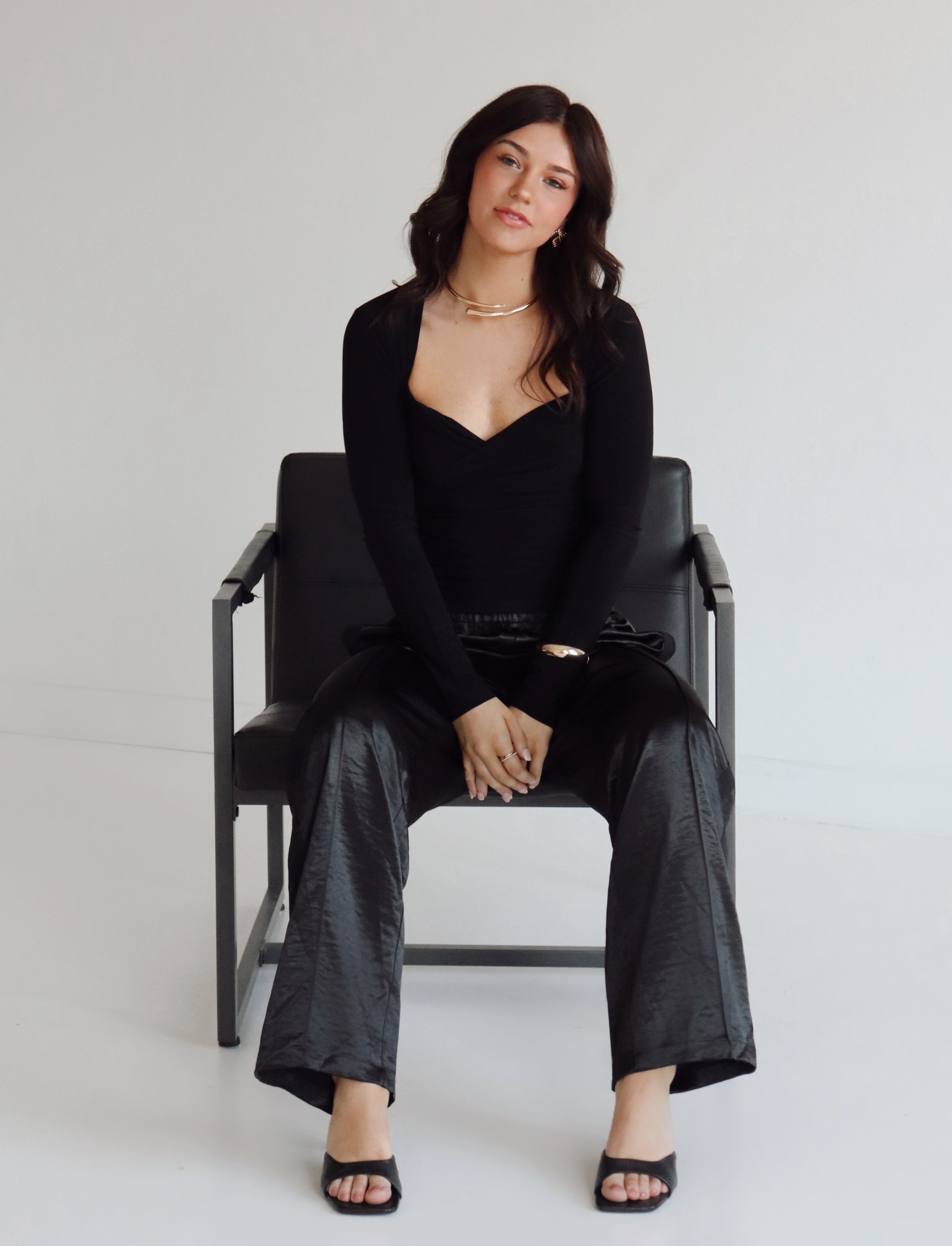 Introducing the Sophia Top. This fitted black top has a wide neckline, long sleeves, and front ruching for added dimension. Pairs perfectly with relaxed denim or track pants for effortless, balanced style.